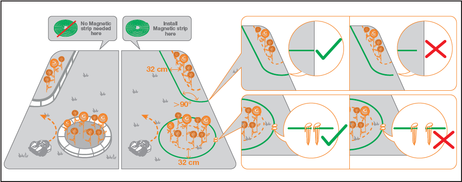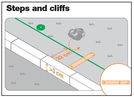 Pokud jsou schůdky na hranici trávníku pokryté trávou a je pod nimi také tráva a výška schůdků je větší než 3 cm. Doporučujeme instalovat magnetické pásky kolem okrajů schůdků nebo ponechat cestičku bez trávy širší než 5 cm.