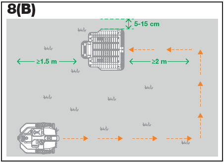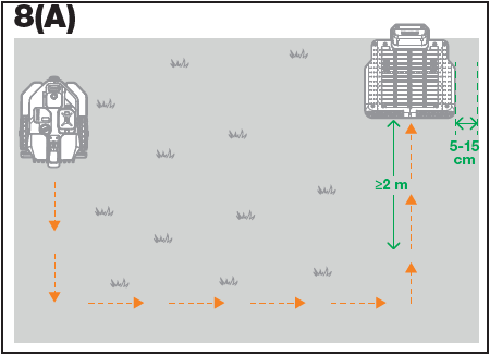 Allow at least a 2 m straight path in front and place it 5-15 cm from the lawn boundary. Ensure at least 1.5 m clearance behind the station for mowing.